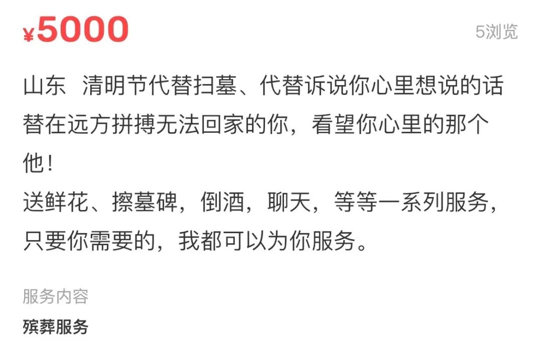 甚至还有开价5000的代祭扫服务,其业务介绍里称,山东临沂清明节代扫墓,可以提供送鲜花、擦墓碑、倒酒、聊天等一系列服务。