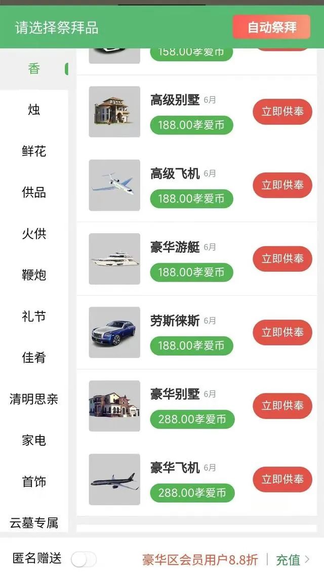在众多祭品里,还有豪华游艇,豪华别墅,豪华飞机。其中最贵的就是豪华飞机,需要288元。