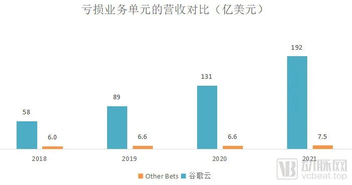 可以看到过去几年里,谷歌云和Other Bets都属于烧钱的项目。然而谷歌云属于逐步向好的趋势,营收逐渐增长,到了2021年,亏损大幅减少46%,并且增速跟上了主要对手的步伐。而Other Bets几年来营收没有本质的变化,亏损倒是一年比一年多,2021年更是达到53亿美元,约合人民币336亿。