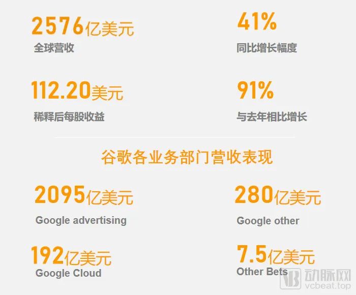 谷歌的母公司Alphabet在近期发布的年报中公布了去年的营收数据。据年报显示,在2021年,公司营收2576亿美元,同比增长41%;归属于母公司普通股股东净利润为760.33亿美元,同比增长88.81%。