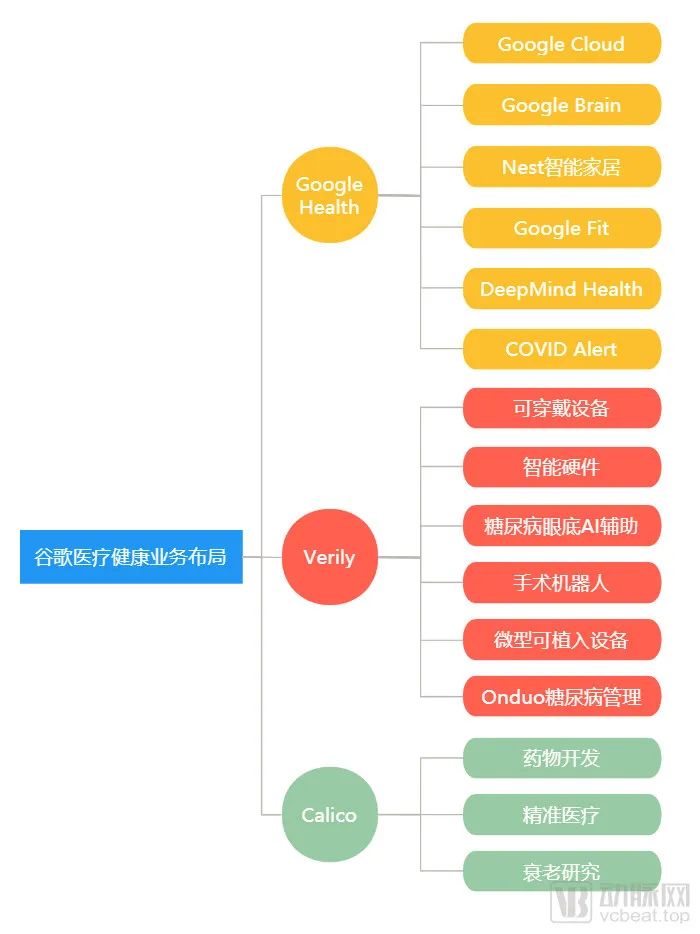 我们先理清一下谷歌这三条业务线各自的布局有哪些。Google Health主要有谷歌云的医疗业务、深度神经网络架构的Google Brain、Nest智能家居、个人健康管理平台Google Fit、DeepMind和用于疫情追踪的COVID Alert。Verily除了针对糖尿病、癌症和药品的研发,还有可穿戴设备、手术机器人等器械的项目,以及社区健康管理应用和对外投资。Calico则相对简单,主要是和制药公司合作用AI技术开发对抗衰老相关疾病的新型药物。