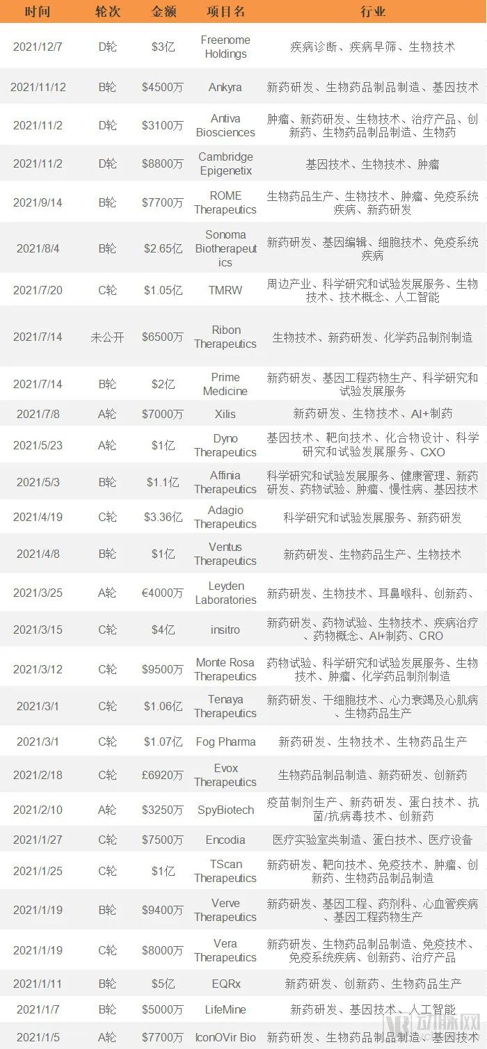 GV在2021年对药物研发初创企业的投资,数据源于动脉橙