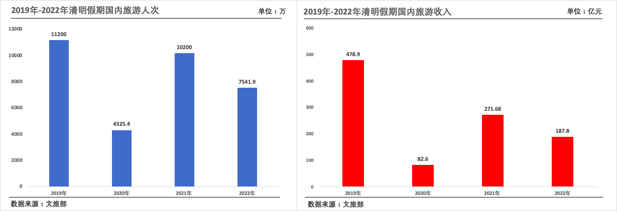 经文化和旅游部数据中心测算,清明节假期3天,全国国内旅游出游7541.9万人次,同比减少26.2%,按可比口径恢复至2019年同期的68.0%;实现国内旅游收入187.8亿元,同比减少30.9%,恢复至2019年同期的39.2%。