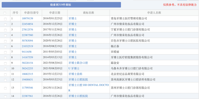 针对牙博士的商标单独检索则大约能检索到319件商标,全国各地存在不同的申请人对该商标进行申请。
