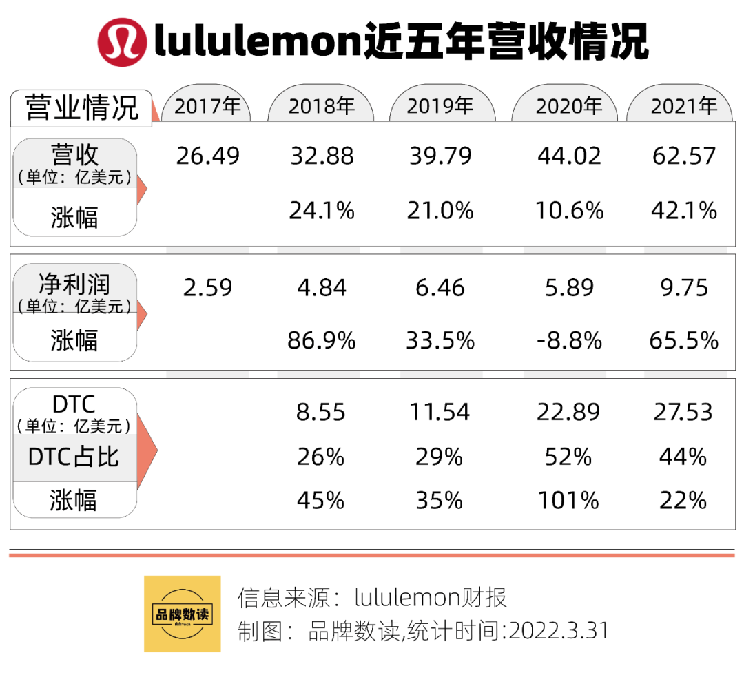 因为2020年疫情首次爆发,拉低了基数,品牌的财报表现普遍出现了增长。但lululemon在2020年依然保持了10.6%的营收增长,2021年的数据与2019年相比,营收增长幅度达57.3%,净利润增幅为50.9%,涨幅更加明显。