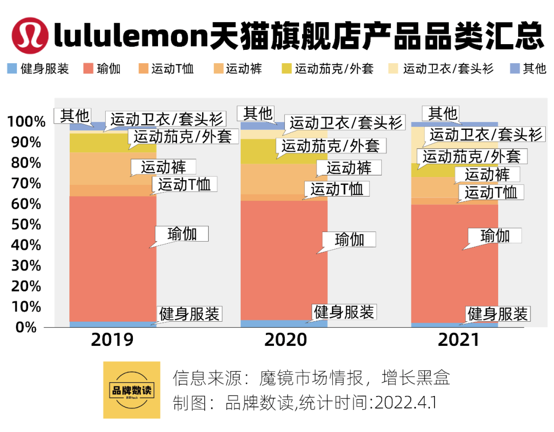 从产品上看,近几年lululemon在瑜伽服外,还拓展了运动T恤、运动夹克外套、运动卫衣/套头衫等,根据增长黑盒数据,从2019年至2021年,瑜伽服之外产品占GMV的比例逐渐扩大,运动卫衣/套头衫表现最为明显。