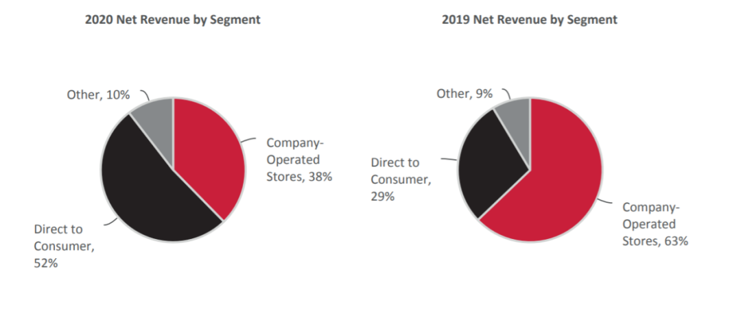 图源:lululemon财报注:左图为2020年净收入占比图,右图为2019年;Direct to Consumer即DTC,Company-Operated Stores即为直营门店