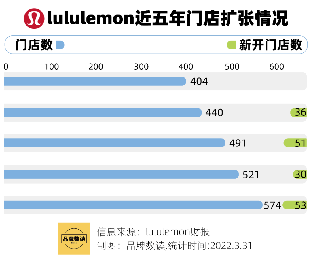 在线下渠道的拓展上,lululemon一直都保持着相对稳定的增速。2020年,受疫情影响,lululemon放缓了在全球的开店速度,开店数量由2019年的51家降为30家。2021年又有所提升,全年开店53家门店,恢复至2019年的开店节奏。其中,在国内lululemon也进入了更多城市,在南宁、宁波、济南、合肥、兰州、三亚等城市分别开设了首店,并于去年第三季度开除了首个机场店——深圳宝安机场店。