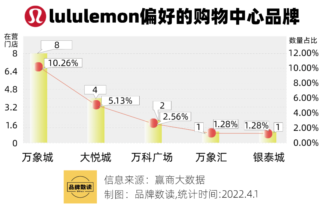 目前,lululemon在中国市场门店总数达71家,主要布局北京、上海、深圳、成都等一线城市和新一线城市。赢商大数据显示,在合作购物中心的偏好上,lululemon更喜欢万象城、大悦城、万科等品牌,占比分别为10%、5%和2%。