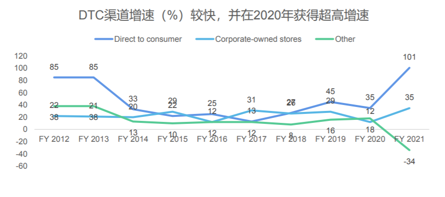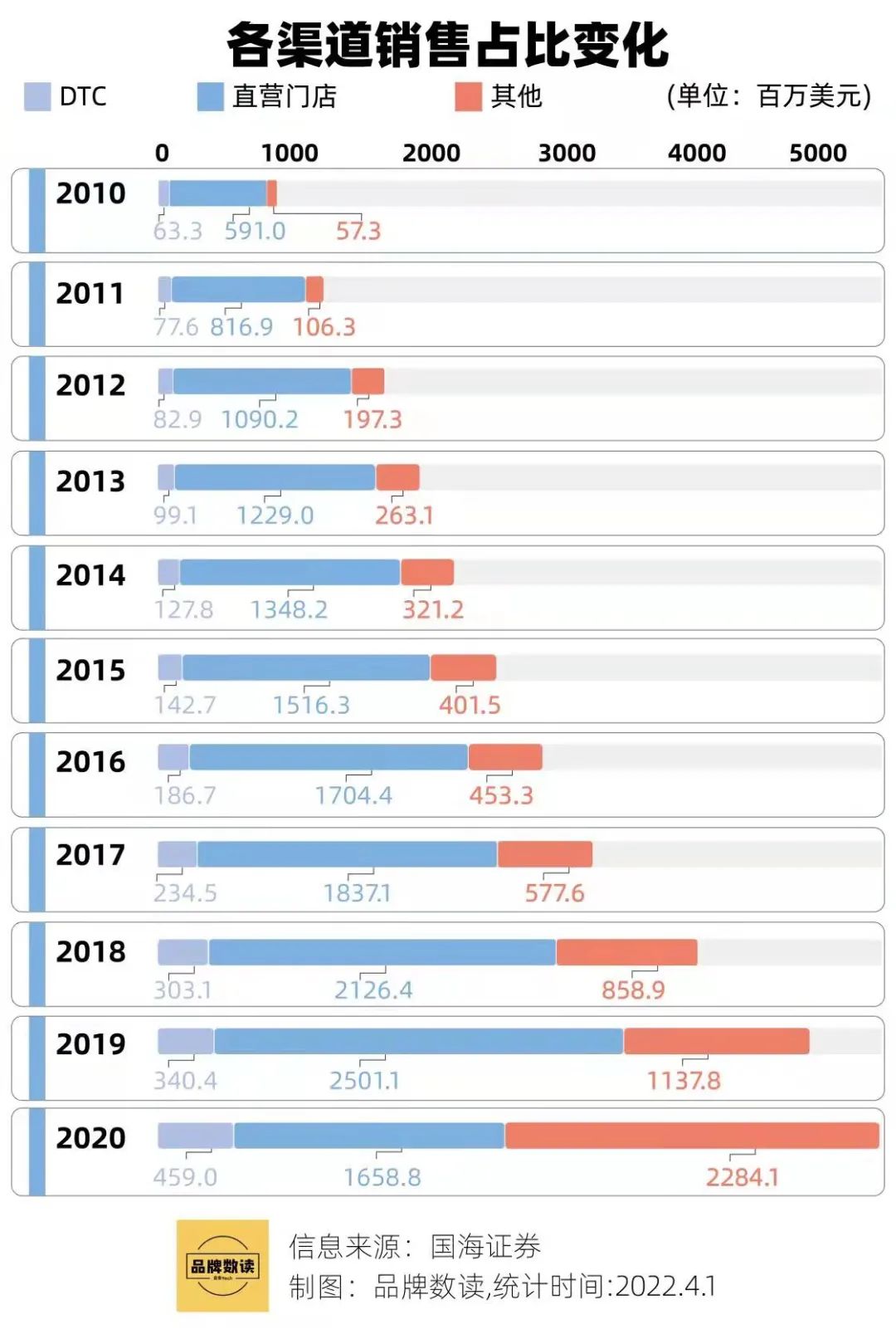 从2017年开始,lululemon的DTC占比稳定在20%~30%。2020年,全球受疫情影响门店关闭,DTC成为其主要销售渠道,该项营收占比超过一半达52%。在行业普遍受影响的情况下,依靠DTC的发力,lululemon的整体营收依然提高了10%。2021年,在线下商业有所恢复的情况下,DTC占比仍高达44%,涨幅为22%,经过计算约为27.53亿美元。