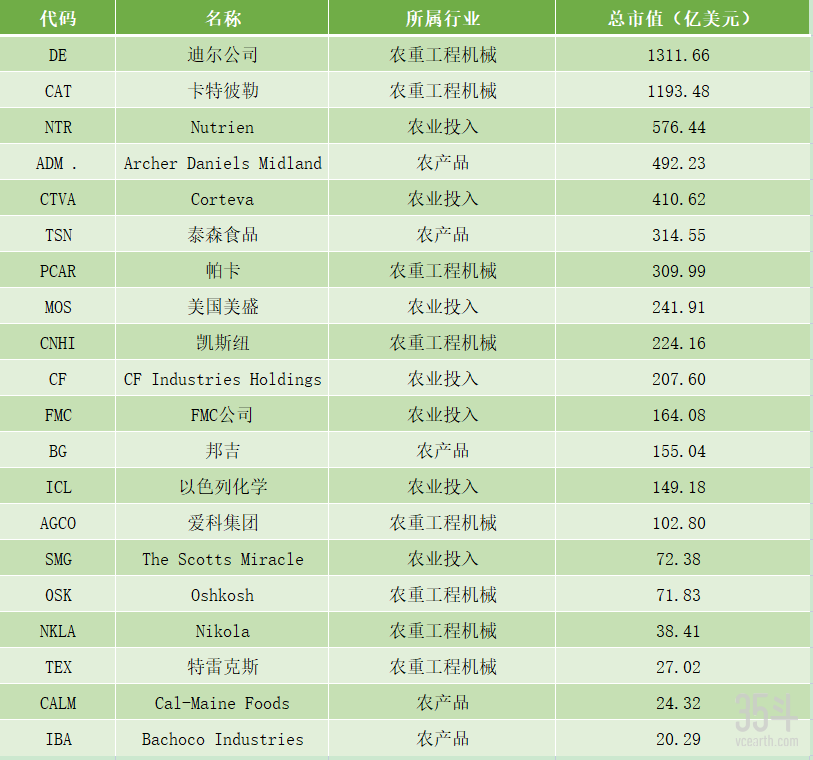 表1:美股排名前20的农业公司(图源:美股,截止日期为3月22日)