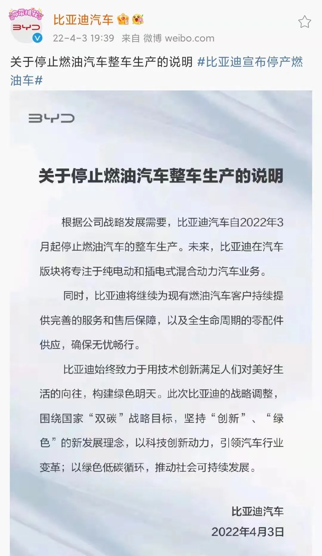 比亚迪停产燃油车公告,图源比亚迪汽车官微