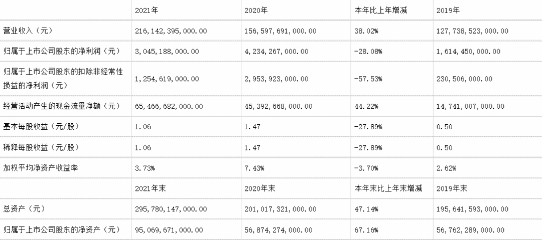比亚迪2021年部分业绩表现,截图自财报