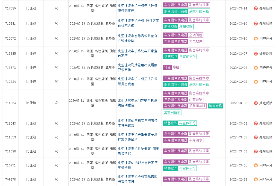 有关比亚迪汉车型的消费者投诉,截图自车质网