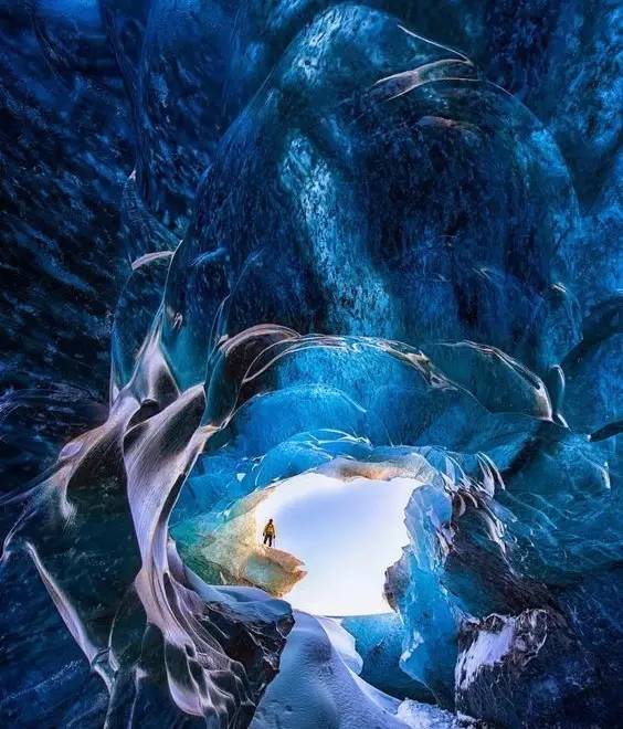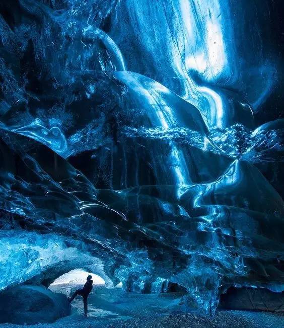 除了极光外,冰岛还有一个神奇的存在——冰洞。你能想象出多少种蓝色,他就有多少。因为这里的冰密度很高,没有气泡,可以吸收所有的光,但只反射出蓝光。但每年夏天,几乎所有的冰洞都会融化坍塌,到了冬天再形成新的冰洞,所以,没人知道新的洞穴会出现在哪。