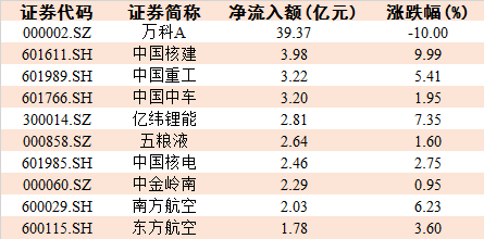 万科A(000002.SZ)、中国核建(601611.SH)、中国重工(601989.SH)领衔今日十大资金净流入个股,其资金净流入额分别为39.37亿元、3.98亿元、3.22亿元。
