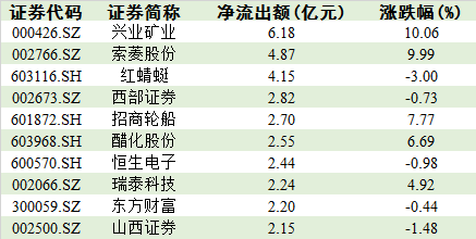 此外,兴业矿业(000426.SZ)、索菱股份(002766.SZ)、红蜻蜓(603116.SH)今日的净流出资金量居两市个股前列,分别为6.18亿元、4.87亿元、4.15亿元。