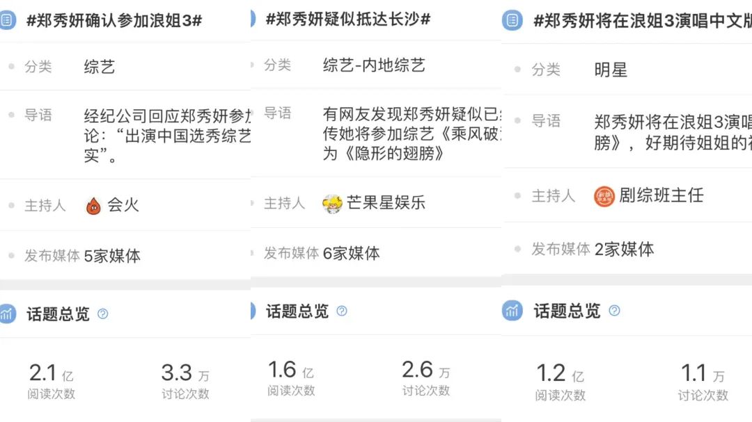 截止发稿前,三条微博热搜#郑秀妍疑似抵达长沙# #郑秀妍确认参加浪姐3# #郑秀妍将在浪姐3演唱中文版隐形的翅膀#的累积话题总览量逼近5亿。