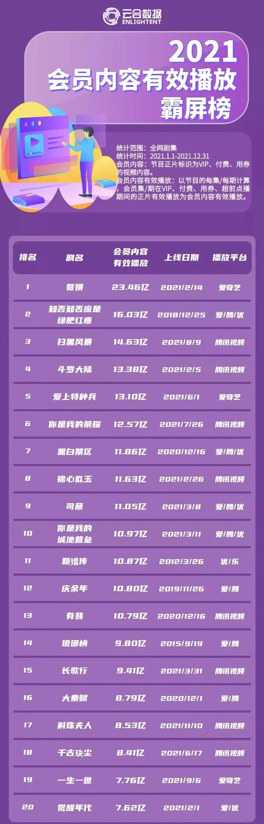 据云合数据,2021年,芒果TV独播剧比例由2020年的38%大幅上涨至59%,但在2021云合会员内容有效播放霸屏榜TOP20中,芒果TV却无一剧上榜。与之呼应,2021年,芒果TV剧集有效播放量同比下滑34%,剧集会员内容有效播放量同比下滑21%。