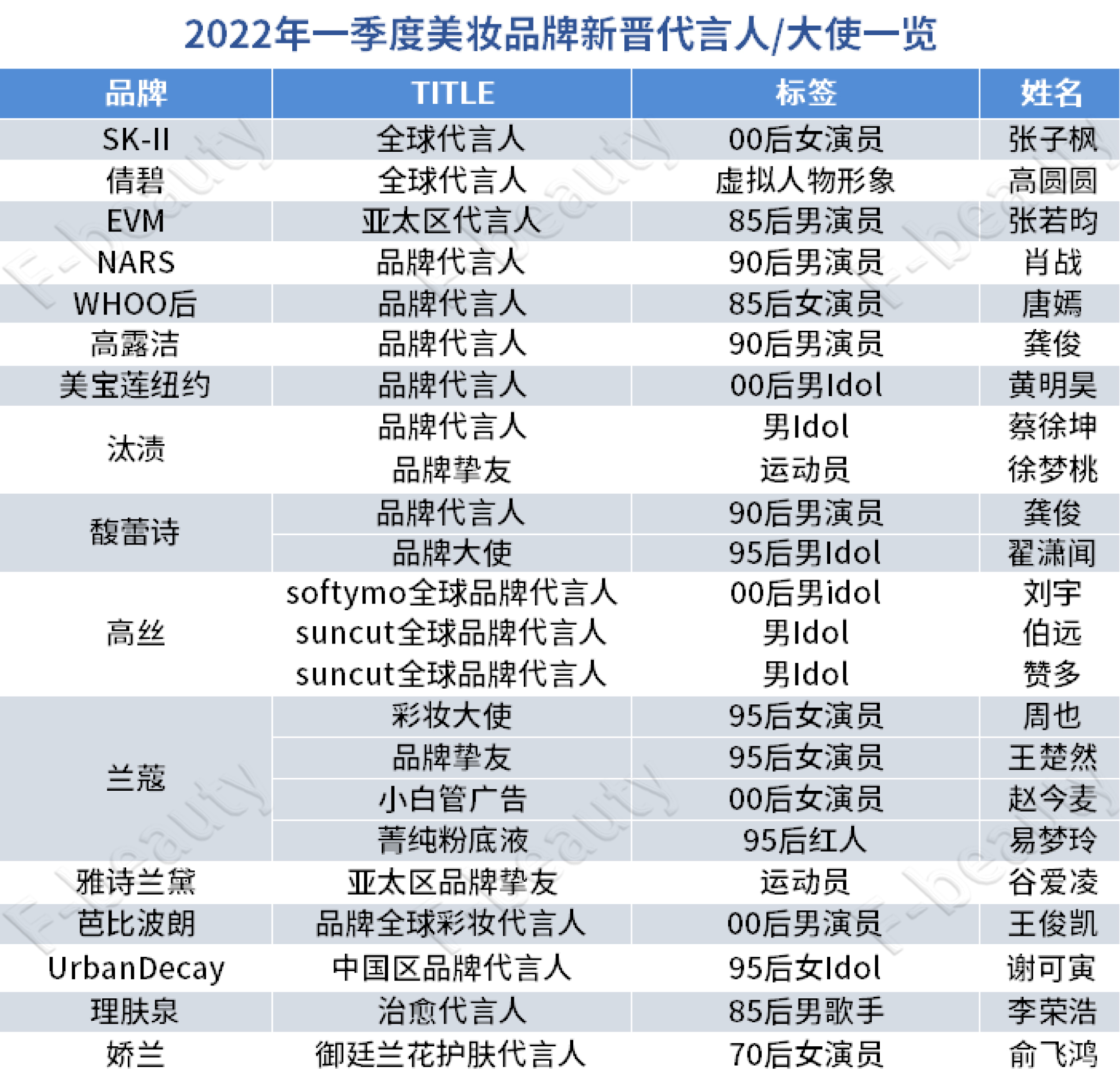 为给以上问题作出解答,《未来迹Future Beauty》盘点了一季度美妆品牌官宣的代言情况(不完全统计),发现共有51个美妆日化品牌官宣了69名代言人、品牌大使和品牌挚友。