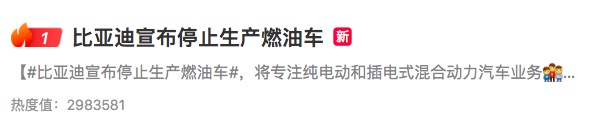 比亚迪停产燃油车消息一出,火速冲上微博热搜榜第一位。