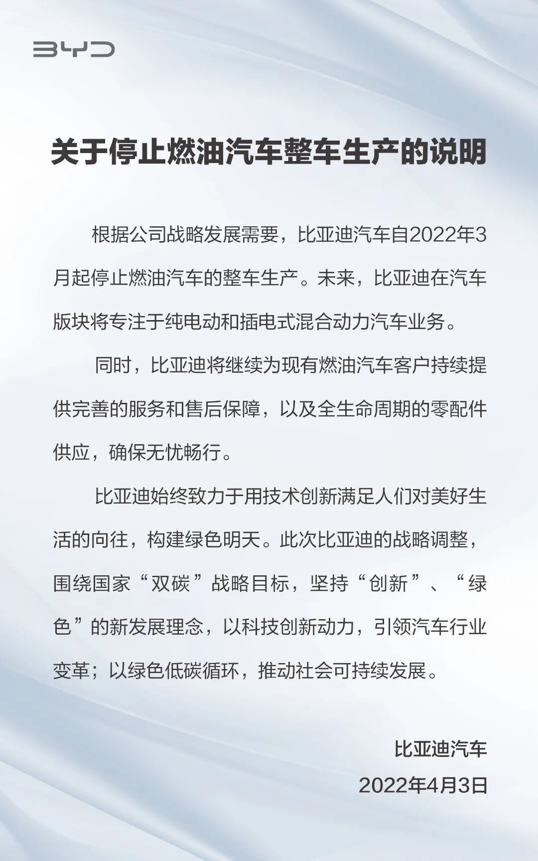 4月3日晚间,比亚迪官宣,自3月起停止燃油汽车的整车生产,未来在汽车版块将专注于纯电动和插电式混合动力汽车业务。