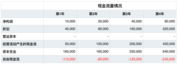 而从现金流的角度,你很容易就会发现,在上面的例子里,越是减少新交通工具的投入,现金流状况就越好。但是即便我们只投资了第1年一个交通工具,累计现金流量也是直到第4年才超过原始的交通工具投入1.6亿。当我们把这4年的现金流贴现(假设12%的贴现率),这些现金流的现值依然小于原始投入1.6亿。