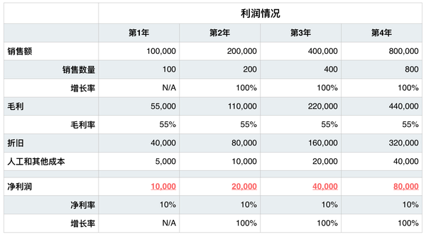 这个公司的首要目标是净利润,所以基于上面的数据,创始人决定投入更多的资金来达到销售额和净利率的翻倍增长,所以在接下来的第2年到第4年分别增加了1个,2个和4个这样的交通工具。