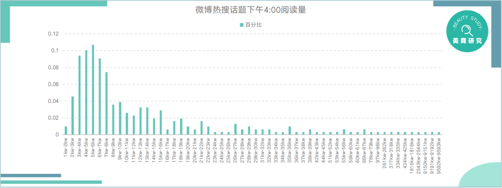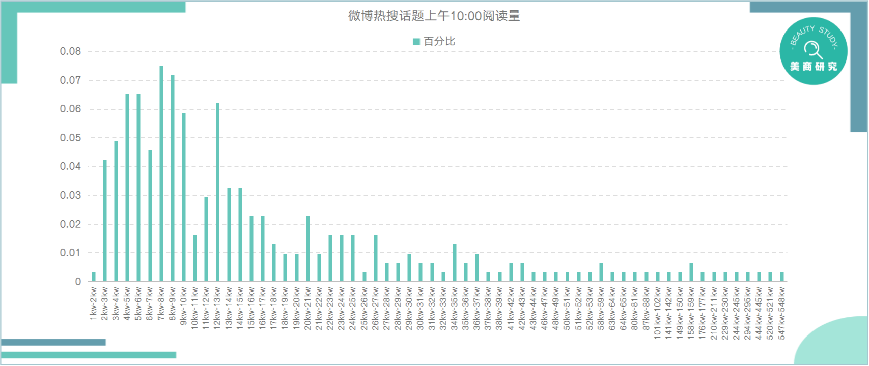 一千万阅读量是新浪微博话题热搜的门槛。搜扬美商研究院研究发现:一般上午的热搜有43.17%的热搜话题阅读量集中在3千万-1亿之间。下午的热搜有54.22%的热搜话题阅读量集中在3千万-1亿之间。