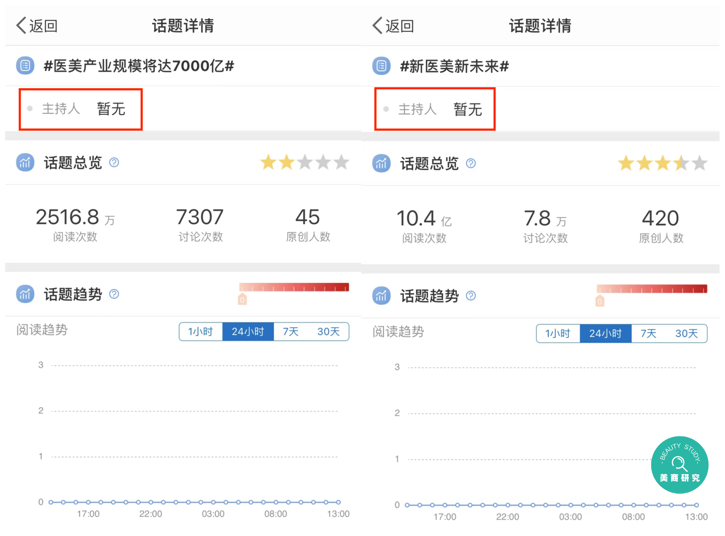 另外,在2022年1月8日新氧举办了中国医美行业的顶级盛会:第七届亚太医美盛典。虽然这个项目前后几个话题“医美产业规模将达7000亿”“新医美新未来”都有2500万到10亿之间的阅读量,但是都因为是典型的医美话题,无法设定主持人而没有登上热搜。