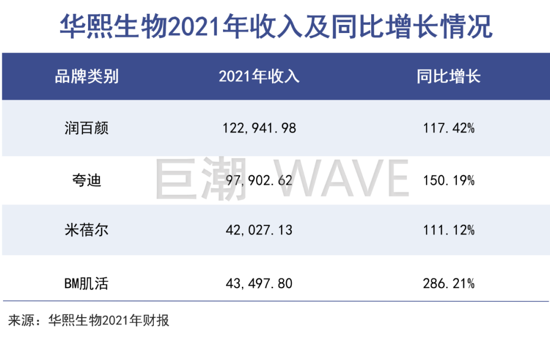 华熙生物董事长赵燕表示:“2021年是华熙生物战略发展的关键年”,除了玻尿酸的高增长之外,主要就是四大品牌。其功能性护肤品收入占总收入近七成,同比增长146.57%,其中润百颜单品首次实现单品牌年收入过10亿元。