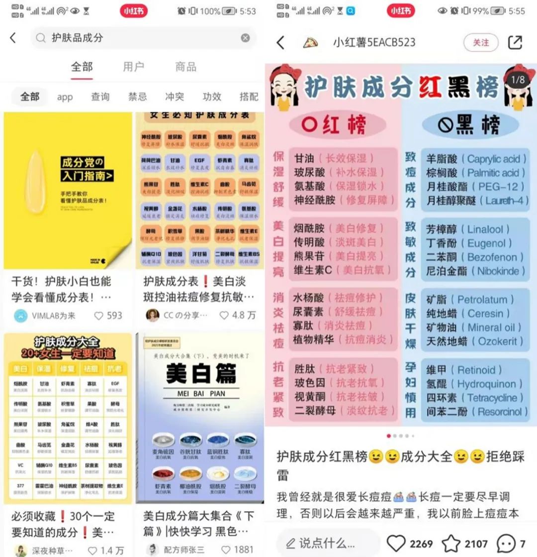 从行业整体情况来看,近几年功能性护肤品快速渗透,消费者对于护肤成分认知不断深入。小红书平台上关于“护肤品成分”的笔记多达126万篇,其中不少博主在笔记里面对护肤品常见成分的功效、适用肤质、产品搭配进行详细解析,不少消费者纷纷加入“成分党”的行列中。