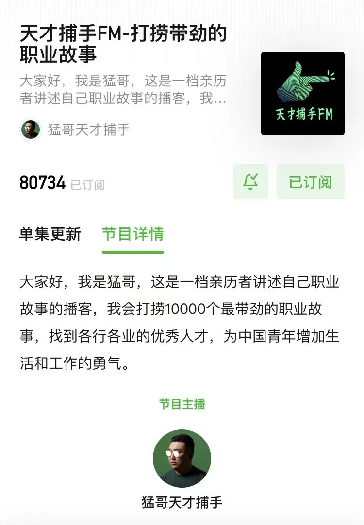 2019年末,天才捕手计划上线播客天才捕手FM,聚焦于职业故事访谈。