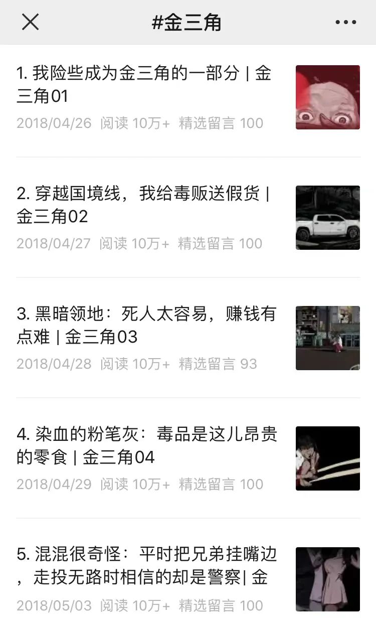 2018年4月26日,一个以《我险些成为金三角的一部分》开篇的系列故事在微信成为爆款,危险、残酷、失控,亲历者沈星星口中的金三角地带让读者在评论区直呼「带劲」。