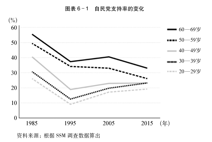 图表6-1显示的是不同的年龄层,从1985年到2015年为止的30年间对自民党的支持率的变化。1995年所有的年龄层对自民党的支持率都大幅下降,这是因为新党的成立导致对政党的支持的结构发生了暂时性的巨大变化,我们从观察长期变化的角度,将其忽略。除此以外,我们可以看到如下的趋势。