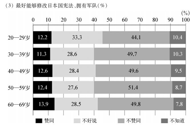 那么认为低学历低收入的底层年轻人正趋于保守化的主张是否正确呢?我们用同样的统计数据,以30岁以下的年轻人为对象,按不同的学历、不同的收入等不同的阶级重新进行分析以后,并未得出底层年轻人具有很强的“排外主义” “军备重视”的倾向的结果。