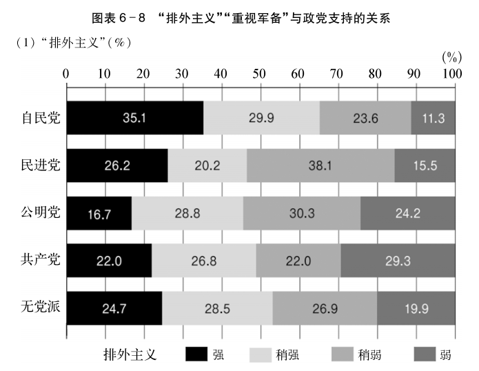 图表6-8是按支持的政党显示的支持“排外主义”和“重视军备”的倾向。关于“排外主义”,2个回答都是“非常赞同”的情况下得6分,2个回答都是“根本不赞同”得0分,此外关于“重视军备”也是如此,2个回答都是“赞同”得4分,2个回答都是“不赞同”得0分,如此这般将回答变换成分数,然后再根据得分大小,分成四个阶段,以将回答者可以均衡地分类,然后再进行统计。