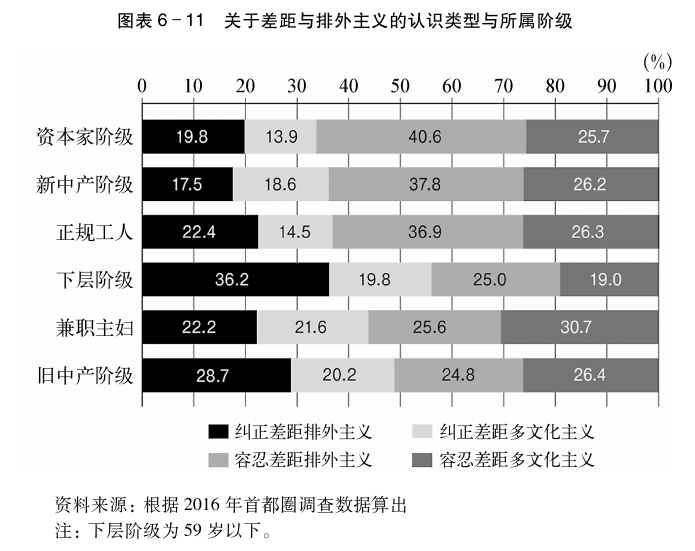 资本家阶级、新中产阶级、正规工人中,采取对收入再分配持消极态度但是排外主义倾向强烈的“容忍差距排外主义”立场的人最多,分别占到40.6%、37.8%和36.9%。其次是对收入再分配持消极态度但不支持排外主义的“容忍差距多文化主义”立场,分别占到25.7%、26.2%和26.3%。