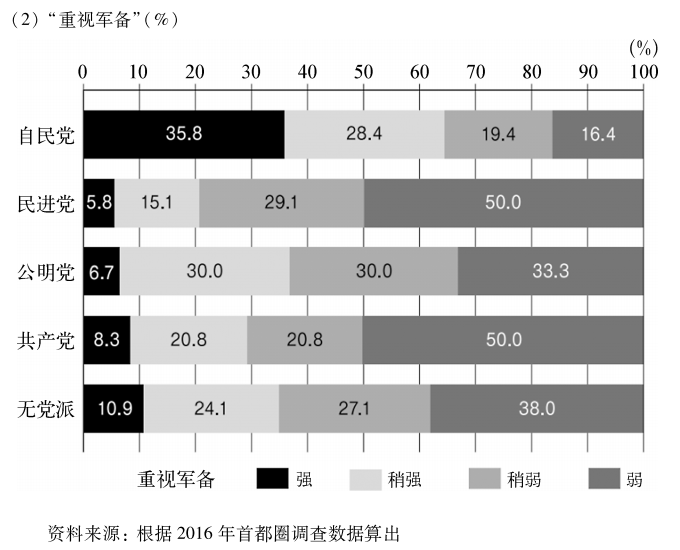 支持“排外主义”和“重视军备”的人非常倾向于否认差距扩大的事实,反对收入再分配。但是,在做进一步分析之前,让我们来确认一下“排外主义”“重视军备”与政党支持的关系。
