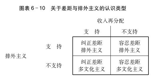 上面,我们将支持收入再分配的倾向与排外主义的倾向分成四个阶段进行了统计,现在我们将其进一步简化成两个阶段,将这两种统计方法组合成图表6-10。根据这张图表,“关于收入再分配与排外主义的认识”被区分成四个类型。这四个类型与所属阶级的关系如图表6-11所示。