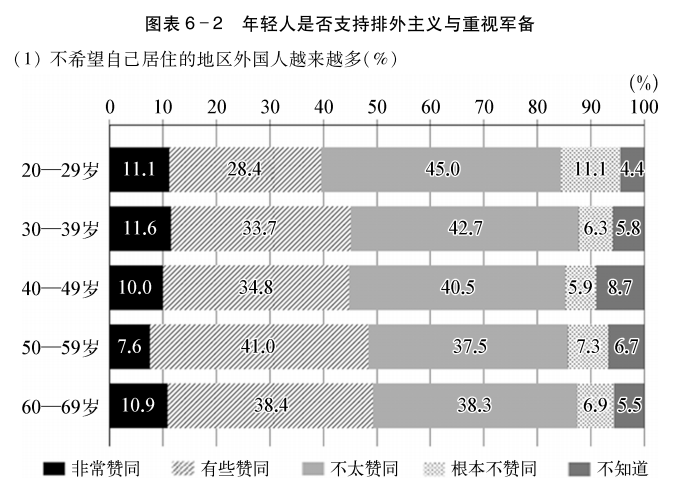 那么,根据不同的年龄层来看一看这些答案,会有怎样的结果呢?如图表6-2所示,结果简单明了。年轻人与其他年龄层的人相比,并没有明确支持“军备重视”的主张。确实,对“军备重视”这一题,20多岁的年轻人回答“赞同”和“无所谓”的比率略高一点,而“根本不赞同”的比率低一点,但也不能说与其他年龄层的人有很大的差异。其次,就“排外主义”而言,高年龄层的人反而支持力度更强,20多岁的低年龄层当中,“排外主义”倾向是最弱的。