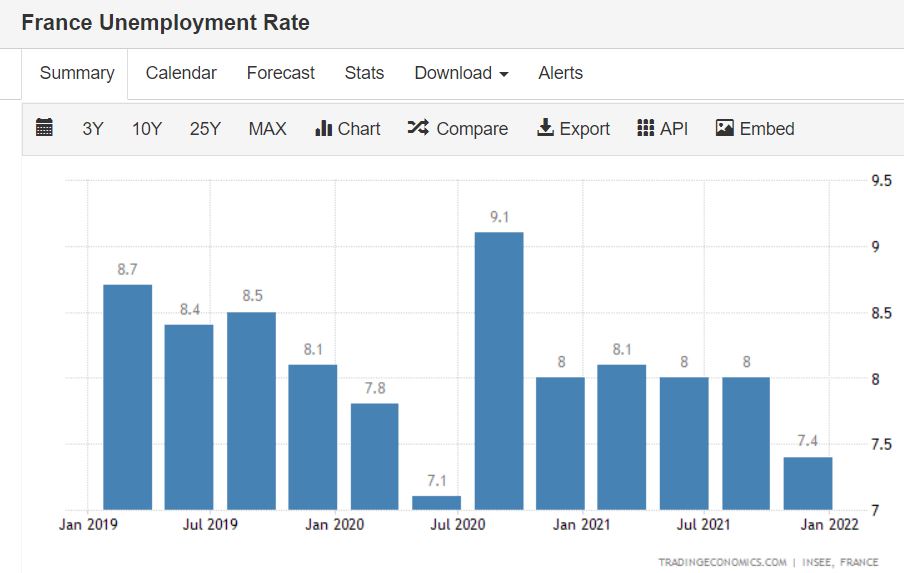 到去年秋天,法国的GDP已经恢复到疫情前水平,为欧盟中经济恢复最快的国家。到2021年底,法国的失业率下降到7.4%,甚至低于新冠疫情前水平,为2008年以来最低。