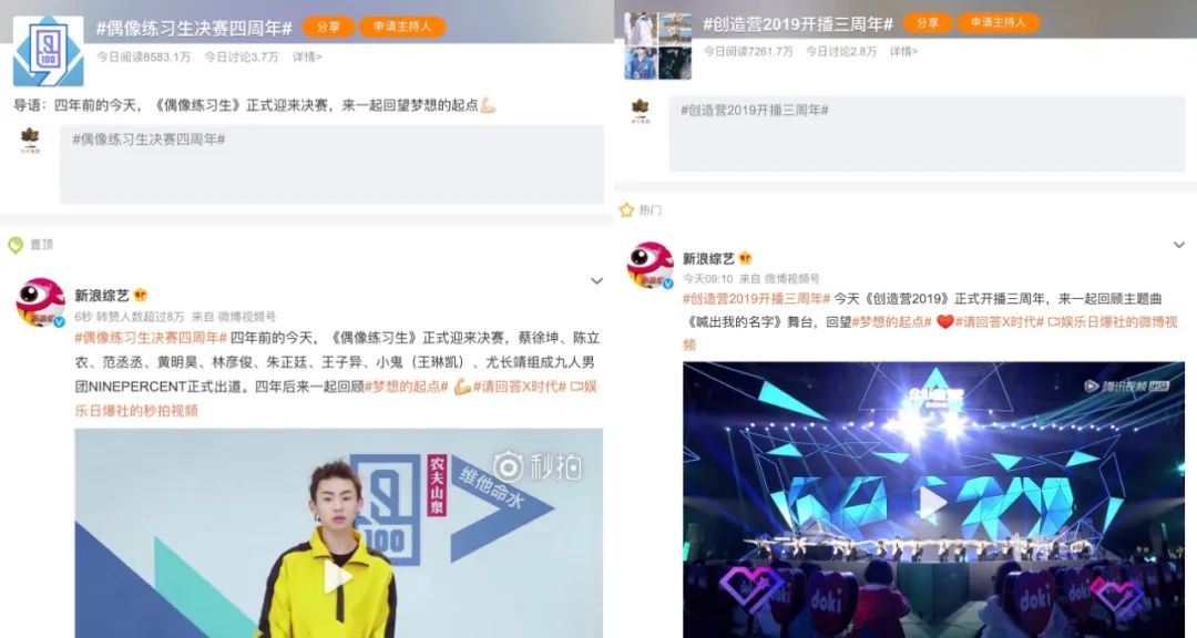 而另一个有意思的现象是,就在4月6日《浪姐3》曝出路透的同时,有两个选秀综艺话题也悄然上了微博热搜,一个是 #《偶像练习生》决赛四周年# ,一个是 #《创作营2019》开播三周年#。这些高热话题共同说明了,虽然秀综没了,但很多人对秀综、唱跳舞台的怀念情绪浓烈,对类秀综的大型唱演节目更为渴求了。