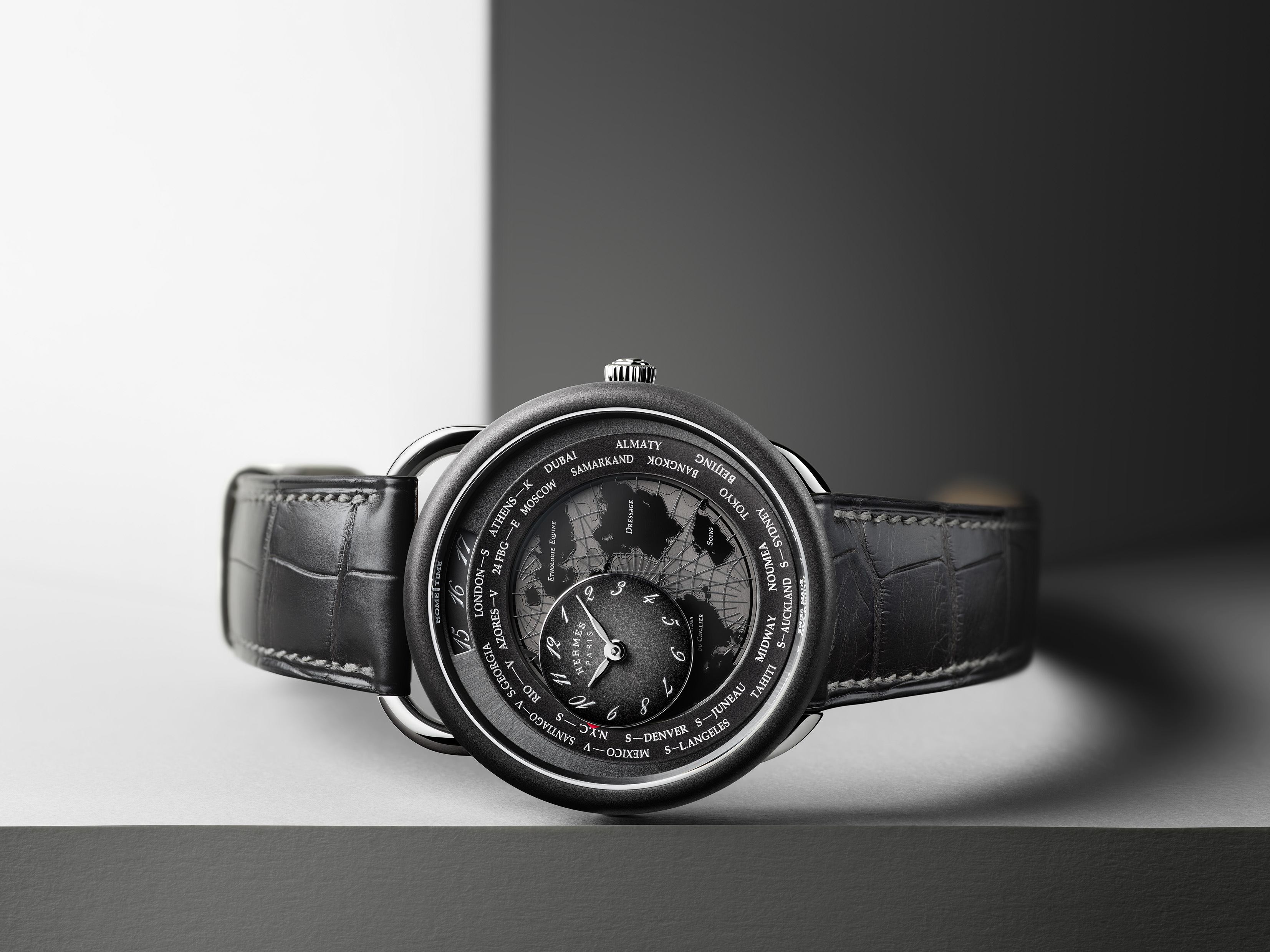 以漫游时光腕表为例,这款腕表的特点在于用新颖的手法来展示世界时间这一经典的复杂功能。爱马仕以丝绸部门推出的《世界马术地图》(Planisphère d’un monde équestre)丝巾图案为灵感,在表盘上开发了一个“漫游时光”装置,通过一个圆盘显示全球24个时区。而在靠近9点位的地方叠加了一个活动计时圆盘,如卫星般环绕着虚拟地图旋转,以实现世界时间展示的目的。