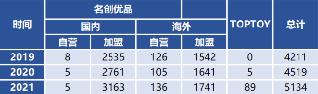 名创优品扩张,渠道上深度绑定加盟商。截至2021年底,名创优品在国内的直营店仅有5家,加盟门店达到3163家。海外渠道虽然自营门店较多,但加盟店数量仍是直营店的10倍以上。