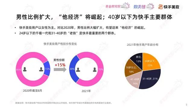 据《2022快手美妆消费趋势》显示,一直以来快手美妆便是以女性为主要消费群体,但在2021年男性比例大幅扩大,相比2020年8月数据增长近15%份额,有望迎来“他经济”崛起。