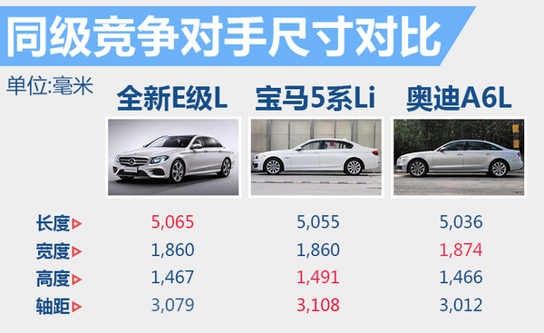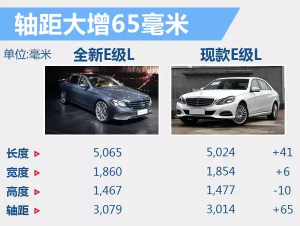 尺寸方面,奔驰全新E级的标准轴距版在长度和轴距方面较之现款大幅增加,专为中国研发的长轴版本尺寸比现款有所增加,新车长宽高分别为5,065*1,860*1,467毫米,轴距为3,079毫米,与现款E级相比车身长度增加41毫米,宽度增加6毫米,轴距长度更是增加65毫米。