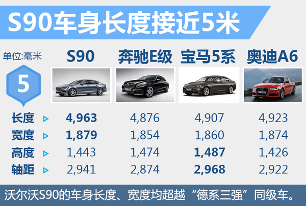 沃尔沃S90车身长、宽、高分别为4963*1879*1443毫米,轴距为2941毫米。与定位于豪华大型轿车细分市场的德系三强相比,沃尔沃车身长、宽均比奔驰、宝马、奥迪更长。虽然,沃尔沃的轴距比5系短了27毫米,但比奔驰、奥迪长。此外,新车将在今年7月上市,后续还将推出V90旅行车。