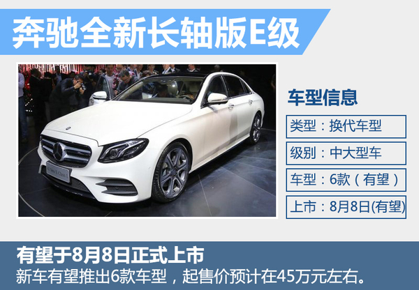 新车将推出E 200L、E 200L运动、E 300L、E 300L运动、E 300L高配、E 300L运动高配共计6款车型,售价区间预计在45万-55万元。