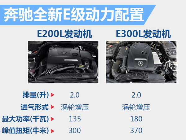 动力方面,新车将搭载两款不同调校的2.0T涡轮增压发动机,其中E200L是沿用现款车型上的2.0T发动机,最大功率135千瓦,最大扭计300牛米;E300L发动机则拥有更强的动力,最大功率180千瓦,最大扭矩达到370牛米。